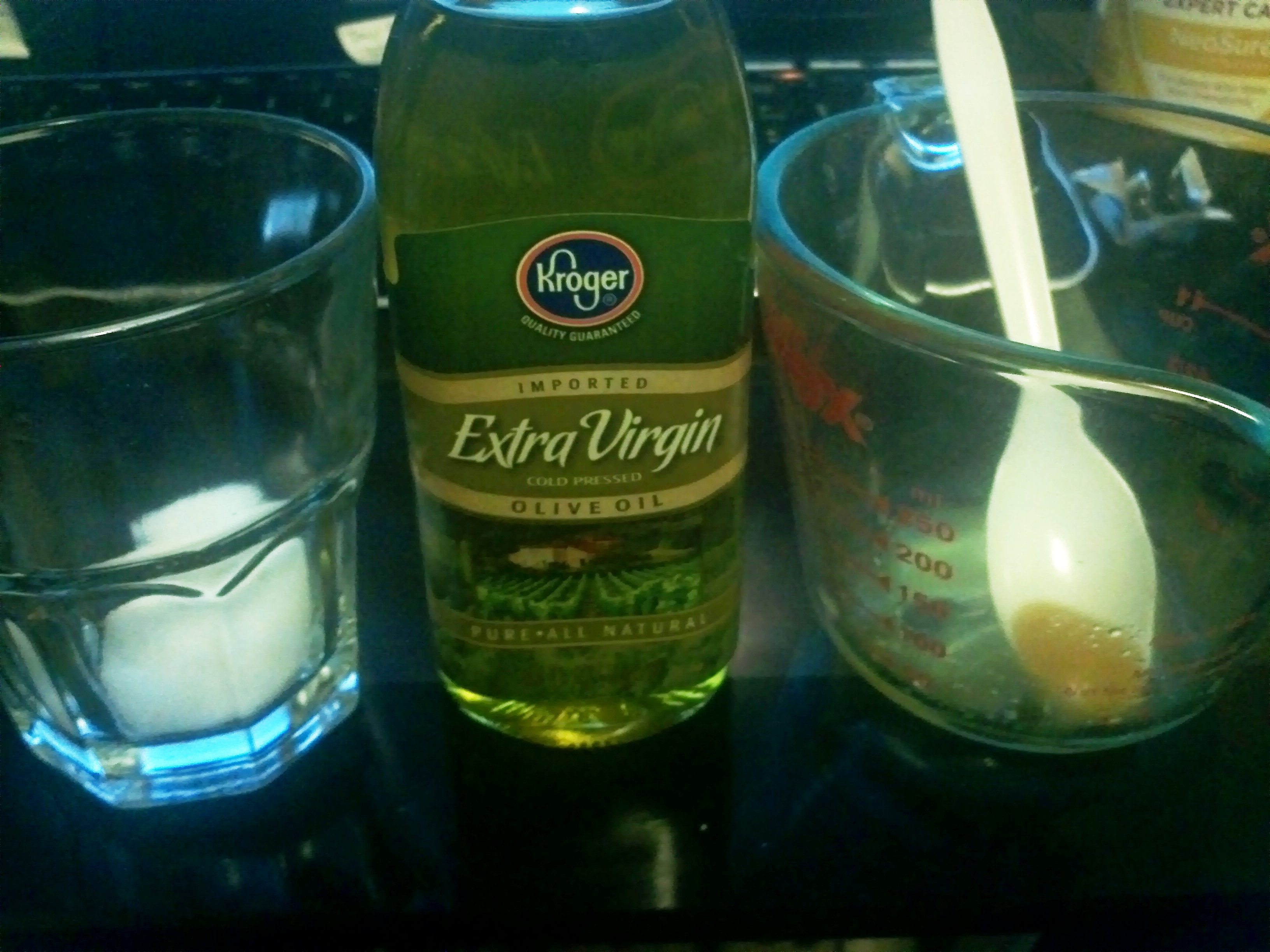 Sugar, olive oil, a spoon, pyrex pitcher, and that goopy stuff on the spoon is what your mixture will look like.